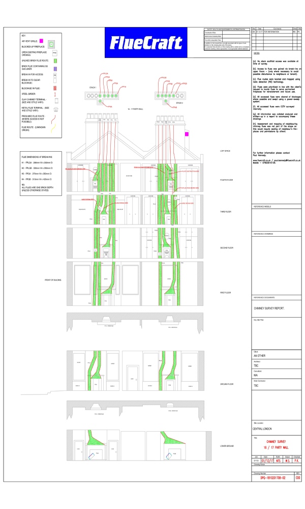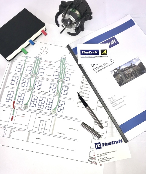 Survey reports can range from a basic single fireplace and flue drawing to a full dimensionally detailed report outlining positions for multiple flues on CAD / PDF drawings with CCTV footage, photographic detail, fireplace design calculations, sweeping and blockage clearance and full recommendations for re-lining and fire installation.